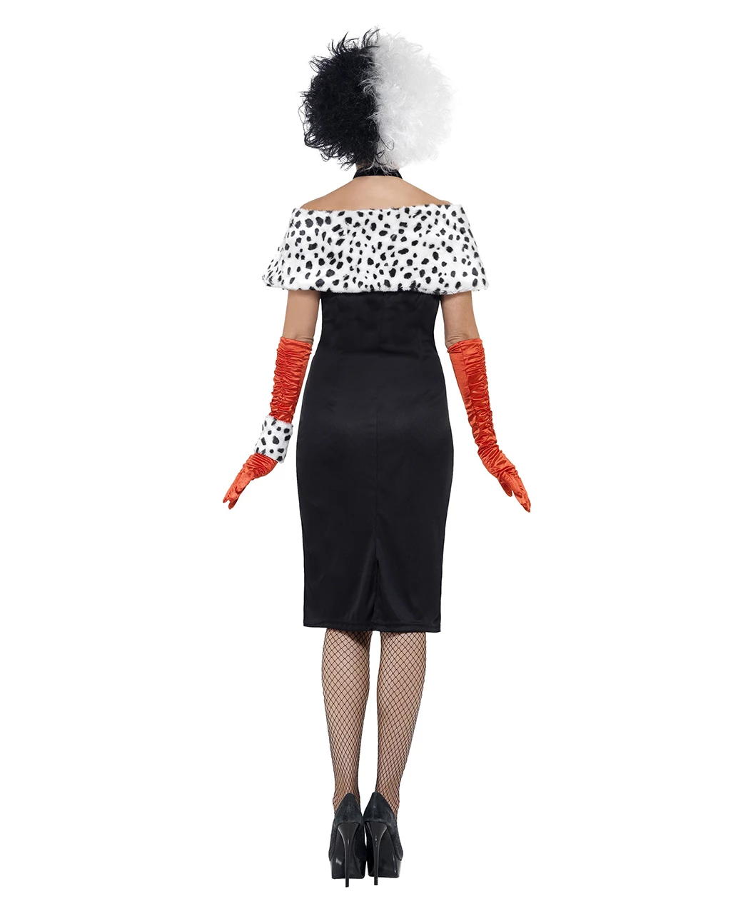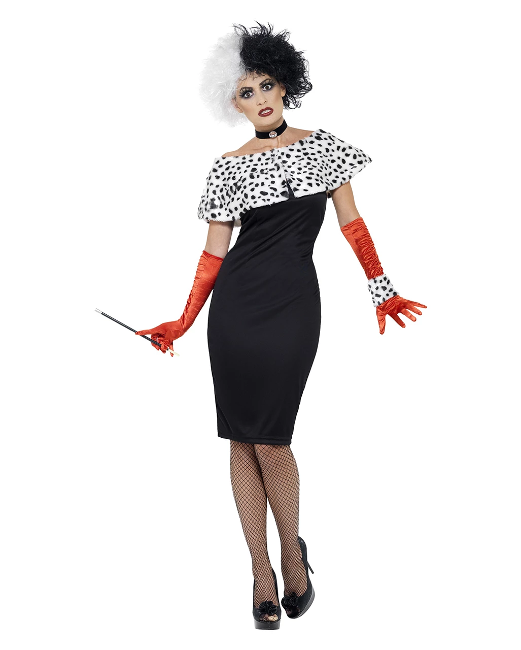 Das Evil Madame Kostüm besteht aus einem schwarzen Röhrenkleid das bis zum Oberschenkel geschnitten ist. Um bequem in dem sexy Kleid laufen zu können wurde am hinterem Rockteil ein Gehschlitz eingebracht. Zu dem trägerlosen Kleid gehören ein Paar rote glänzende Satinhandschuhe, die bis über den Ellebogen gezogen werden. Der zum Hexenkostüm gehörige Bolero und die Handgelenkstulpe sind aus Plüsch und in schwarz weiß gehalten. Die passende Kopfbedeckung zum Kostüm der Dalmatinerhexen wäre zum Beispiel die Frankenstein Monsterbraut Perücke schwarz / weiß.