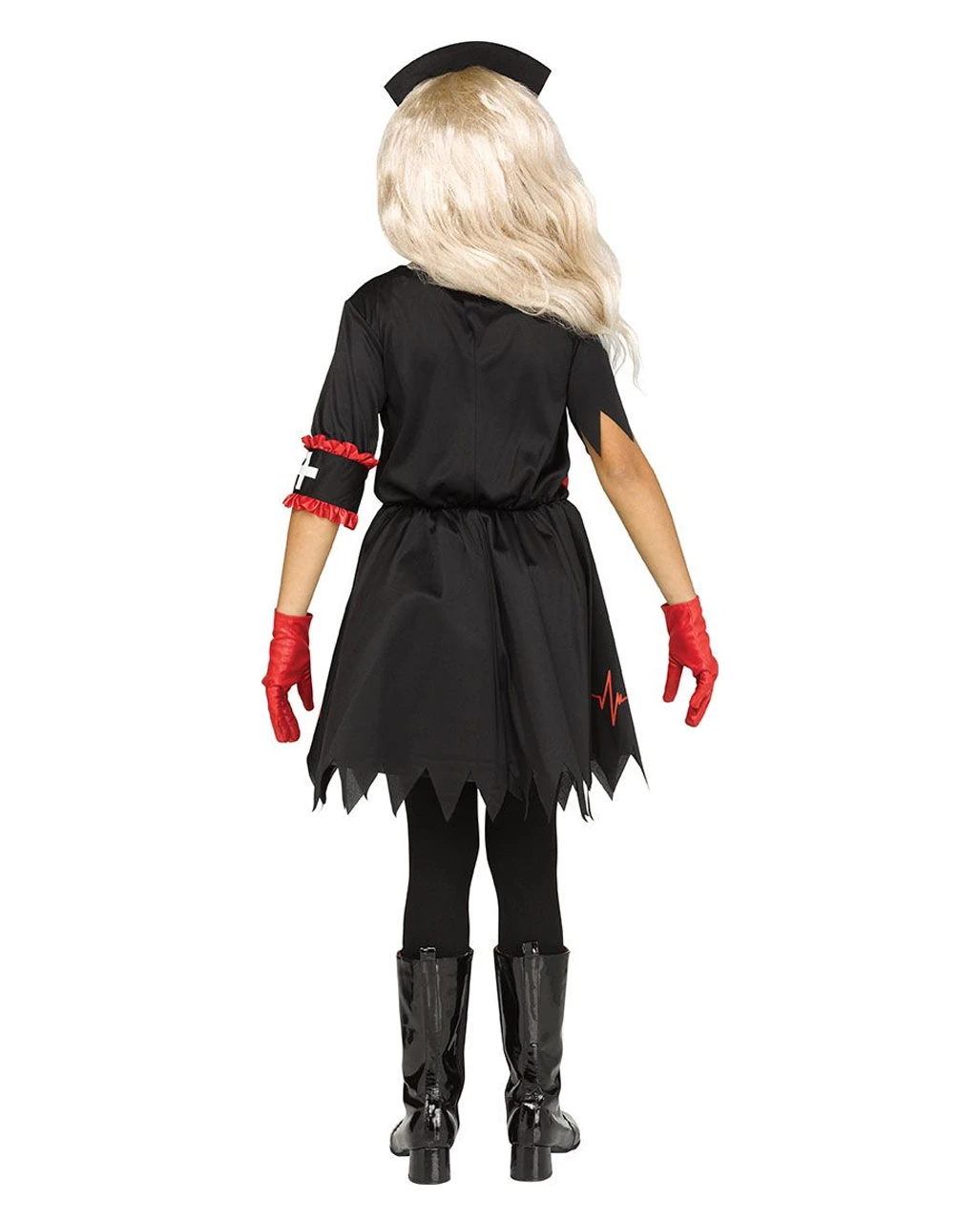 Unser Horror Krankenschwester Kinder Kostüm ist ein geniales Set für junge Gruselfans. Das Kleid des Halloween Kinder Kostüm sieht aus wie eine schwarze Krankenschwestern Tracht. Ein paar geniale Details wie die EKG-Linie über dem Saum, die Blutflecken und die weiße Schürze machen das Halloween Mädchen Kostüm einmal mehr zum Hingucker. Zu der Verkleidung gehören außerdem die roten Handschuhe und der Haarreif mit Schwesternhaube.