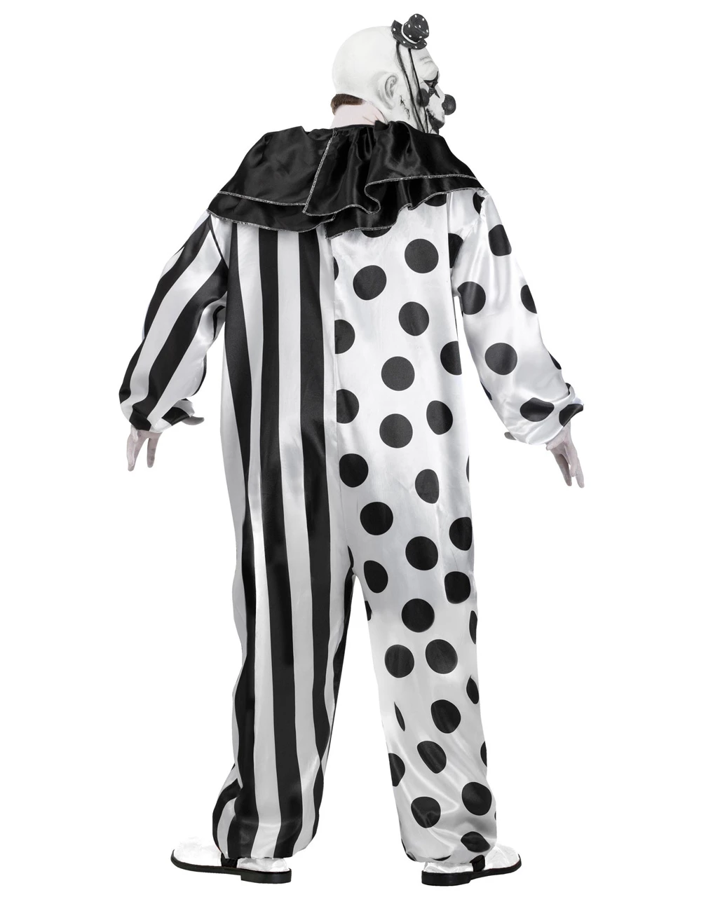 Das Killer Clown Kostüm besteht aus einem Overall, einer Horror Clown Maske mit Hütchen und einem Kragen. Der Overall ist übergroß, auf der rechten Seite ist er weiß mit schwarzen Punkten, links schwarz-weiß gestreift. Arme und Beine haben unten einen Gummizug. Der schwarze glänzende Kragen bedeckt die Schultern, Brust und oberen Rücken. Die Vollkopf-Maske zeigt schwarze Lippen, schwarze Nase und schwarze Sterne um die Augen auf weißem Hintergrund. Ein kleines schwarzes Hütchen ist oben auf dem Kopf befestigt, darunter verlaufen zwei dünne Haar-Strähnen. Über die Stirn verläuft eine tiefe Schnitt-Wunde. Die Clown Schuhe schwarz und weiß kariert, etwas Clownweiß Make Up für die Hände und ein Horror Clown Machete 98 cm als tödliche Waffe, so wird der Killer Clown zum Albtraum der Nachbarschaft.