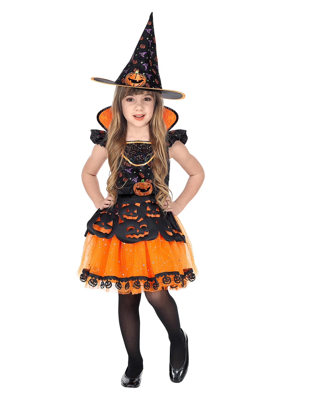Schnappt euch das Kürbishexe Kinderkostüm und freut euch auf die Gruselnacht. Das Halloween Kostüm des Kürbis-Hexenkostüms hat einen orange glitzernden Rock, der am Saum eine Bordüre aus schwarzen Kürbis-Silhouetten besitzt. Das Oberteil ist schwarz mit glitzernden Halloween-Motiven bestückt. Ein oranger Stehkragen ziert das Oberteil zusätzlich. Der schwarze, spitze Hexenhut mit bunten Halloween Motiven perfektioniert das Hexenkostüm. Die Strumpfhose, der Besen und die Schuhe sind nicht im Lieferumfang enthalten