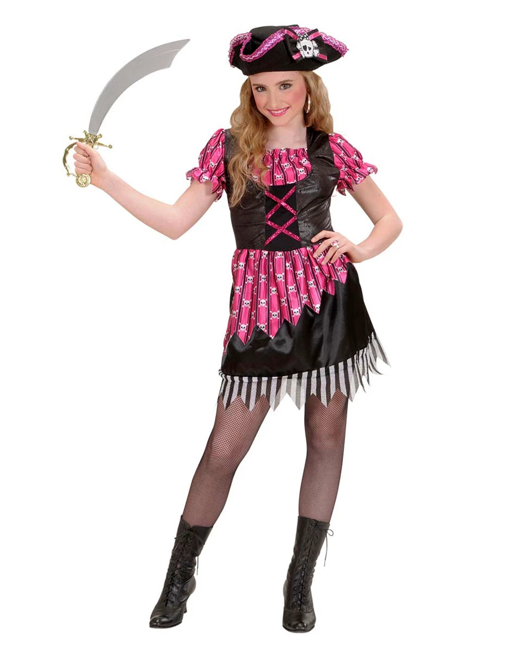 Das Pink Fantasy Piratin Kostüm ist ein schönes, farbenfrohes Buccaneer Outfit für junge Mädchen. Mit dem coolen Piratenkostüm ist der Karneval und Fasching als Abenteuer gerettet und die Schatzsuche kann losgehen. Das Kostüm besteht aus einem kurzärmligem Kleid und einem Piratenhut. Die Ärmel und ein Teil des Kleids sind aus rosa Stoff gefertigt, der mit weißen Totenschädeln bedruckt ist,. Der schwarze Rock besitzt am Saum einen schwarz, silbernen glitzernden Abschluss. Das Oberteil besteht aus Wildlederimitat und besitzt eine rosa glitzernde Verzierung. Der Piratenhut mit Glitzerborte und Totenschädel Applikation ist inkl.