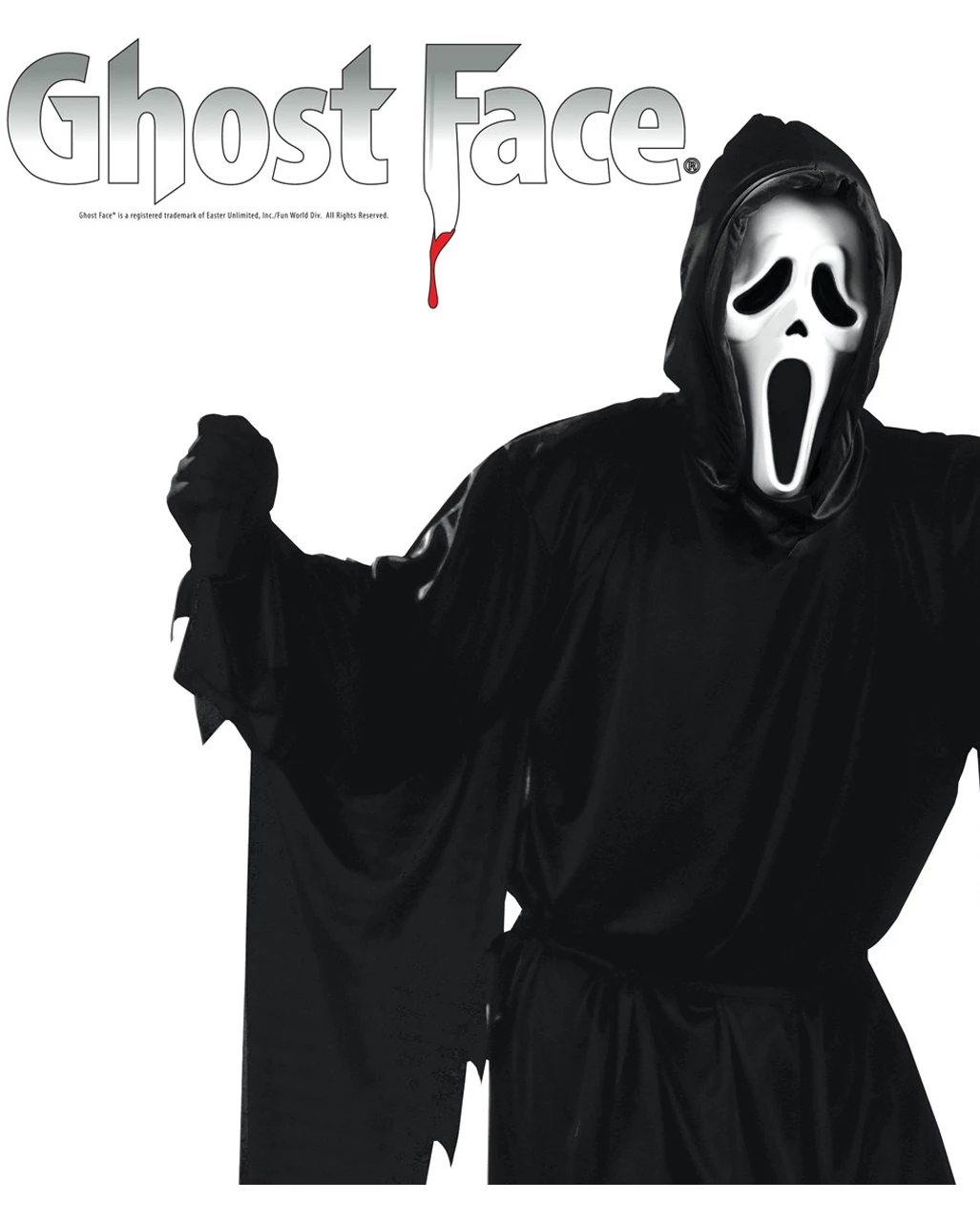Das Scream Kostüm mit Maske ist ein schwarzes, kuttenartiges Gewand mit einer weißen unheimlichen Maske, die dem Bild der“Schrei“ des Malers Edvard Munch nachempfunden ist. Das Scream Kostüm mit Maske ist eines der beliebtesten Halloween Kostüme überhaupt! Mit dem Scream Kostüm mit Maske bist du schnell und preiswert als Serienkiller Ghostface aus dem von Wes Craven gedrehten US Kino Hit „Scream“ verkleidet und jagst damit nicht nur Teenagern einen Riesenschrecken ein. Als hinterhältiger Serienkiller maskiert gehörst du damit zu den bekanntesten Horrorfilm Figuren des US Kinos. Verkleide dich jetzt mit dem lizenzierten Scream Kostüm mit Maske zur Kultfigur und besitze damit einen absoluten zeitlosen Klassiker.