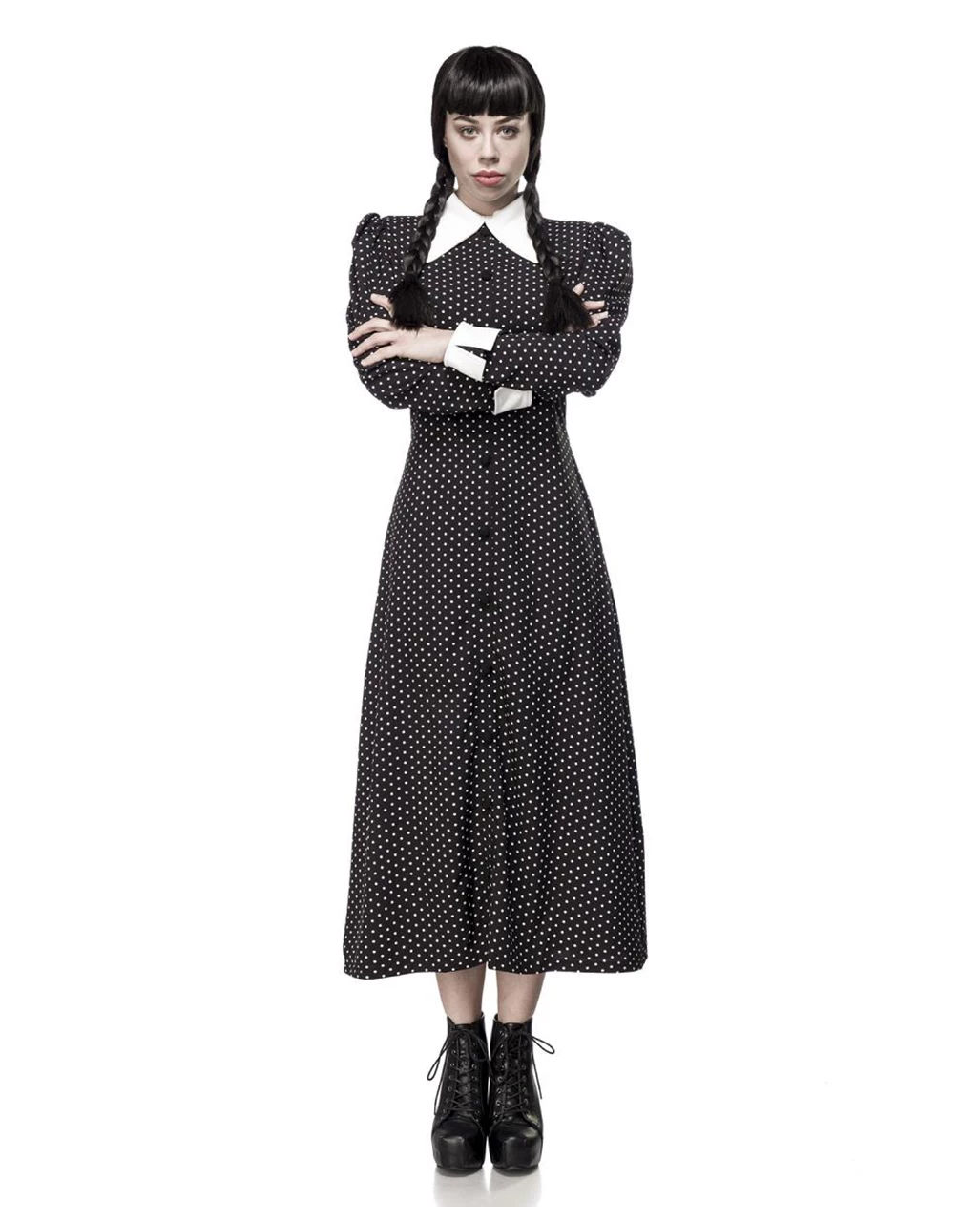 Wenn Wednesday Adams eine Schwester hätte, würde diese wahrscheinlich Tuesday heißen und ihr vom Kleidungsstil in nichts nach stehen. Tuesday liebt genauso wie Wednesday dunkle, lange Kleider mit Puffärmel und großem weißen Kragen. Um den gewissen Unterschied darzustellen und nicht ganz so düster und pessimistisch auszusehen, verfügt das Tuesday Kostüm aus luftigem Stoff über weiße Punkte und einer Zierknopfborte auf der Vorderseite.