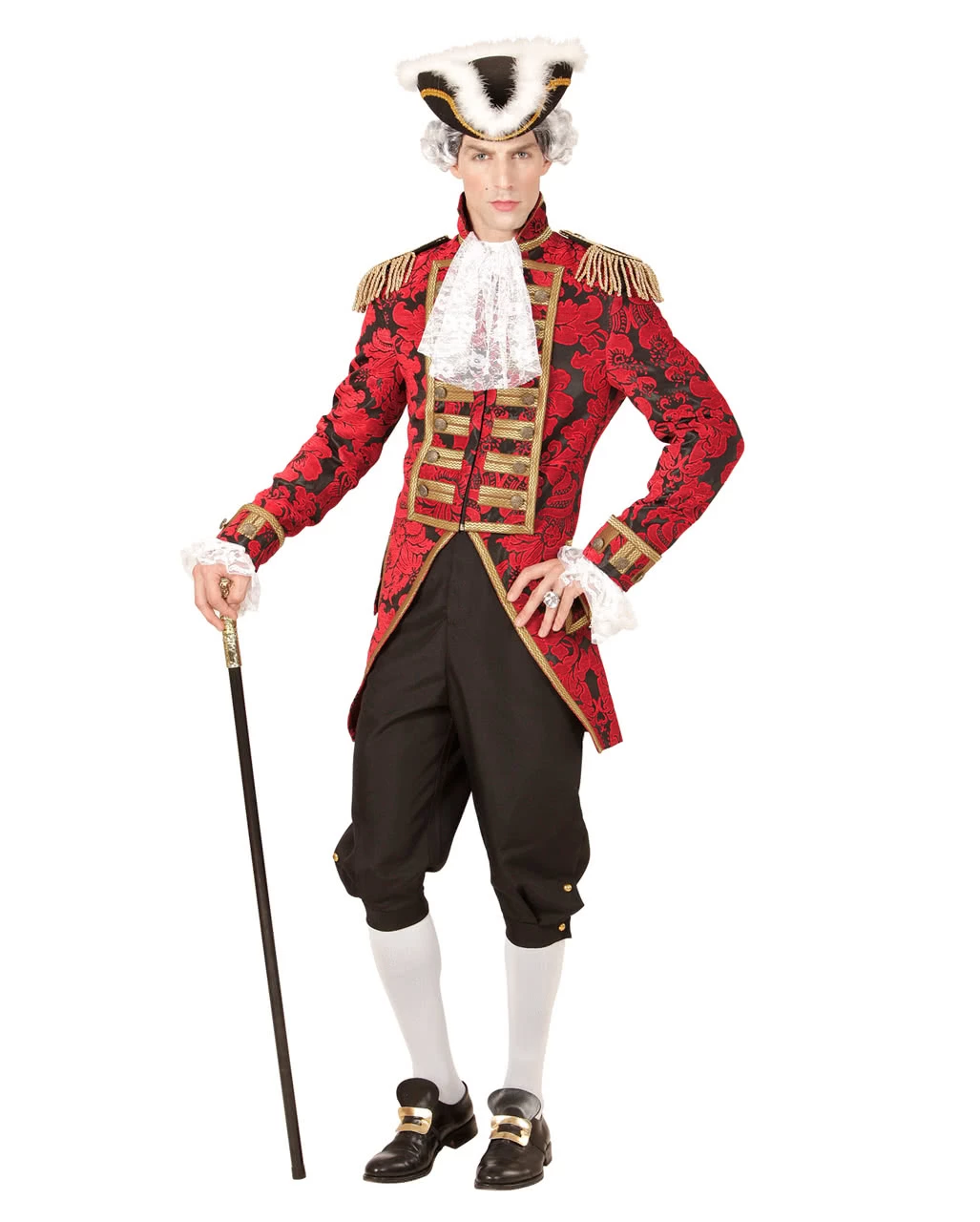 Der rot-schwarze venezianische Frack ist aus schwerem Stoff gearbeitet und besitzt ein wunderschönes florales Muster aus roter Stickerei auf schwarzem Stoff. Die Verzierung aus Goldborte, sowie die Metallknöpfe ergeben zusammen mit den Schulterklappen und deren Fransen den eleganten Gentleman Look.